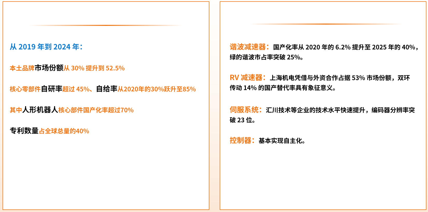 技术创新体系完善:中国在机器人领域的专利数量占全球总量的 40%,有效专利超 19 万项,占全球比重约 2/3。