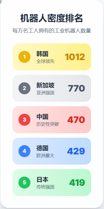 中国已建成3万余家基础级智能工厂、1200余家先进级智能工厂、230余家卓越级智能工厂,覆盖超过80%的制造业行业大类。制造业机器人密度已达 470 台 / 万人,位居世界第三,远超全球平均水平。