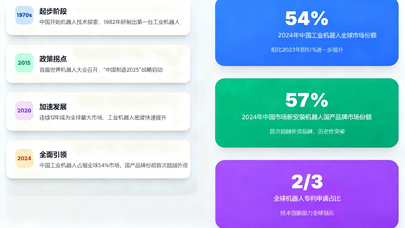 2015 年《中国制造 2025》战略发布,将 "高档数控机床和机器人" 列为十大重点领域之一,明确了机器人产业作为推动制造业智能化升级的核心引擎地位。