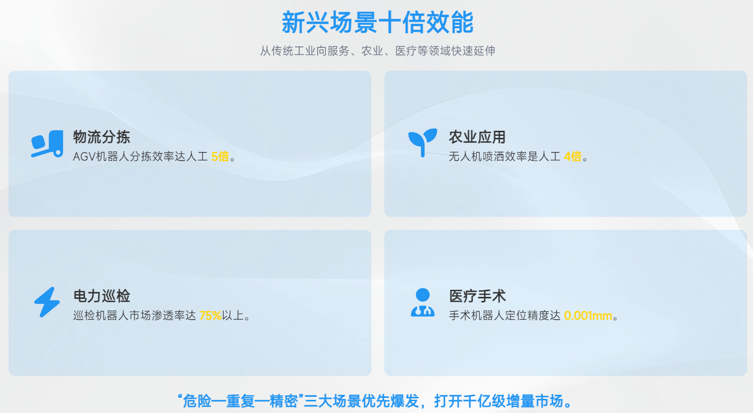 医疗健康:手术机器人、康复机器人等精准医疗设备快速发展。