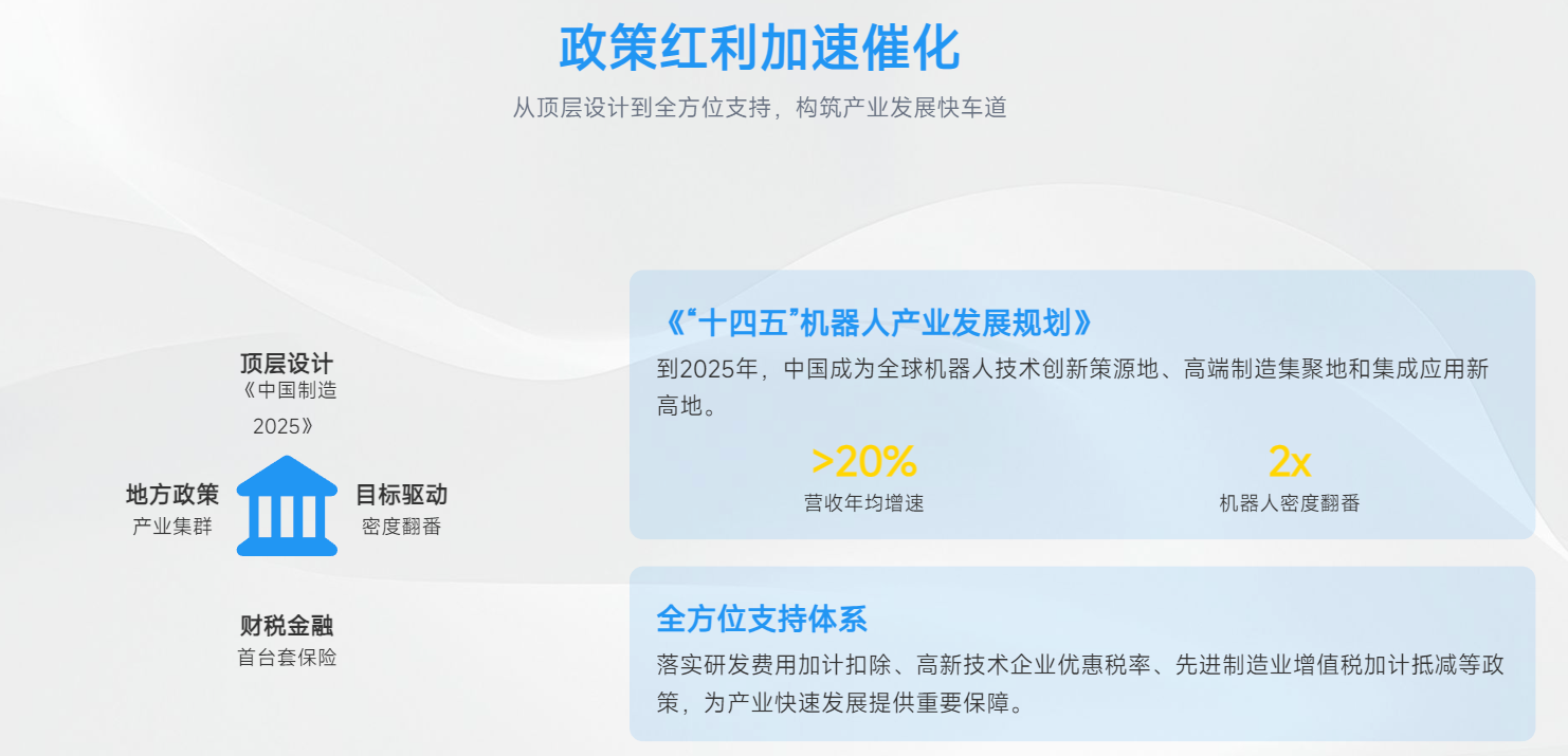 政策红利:2021 年工信部等 15 个部门正式印发《"十四五" 机器人产业发展规划》,明确提出,到 2025 年中国成为全球机器人技术创新策源地、高端制造集聚地和集成应用新高地,机器人产业营业收入年均增速超过 20%,制造业机器人密度实现翻番;到 2035 年,中国机器人产业综合实力达到国际领先水平。