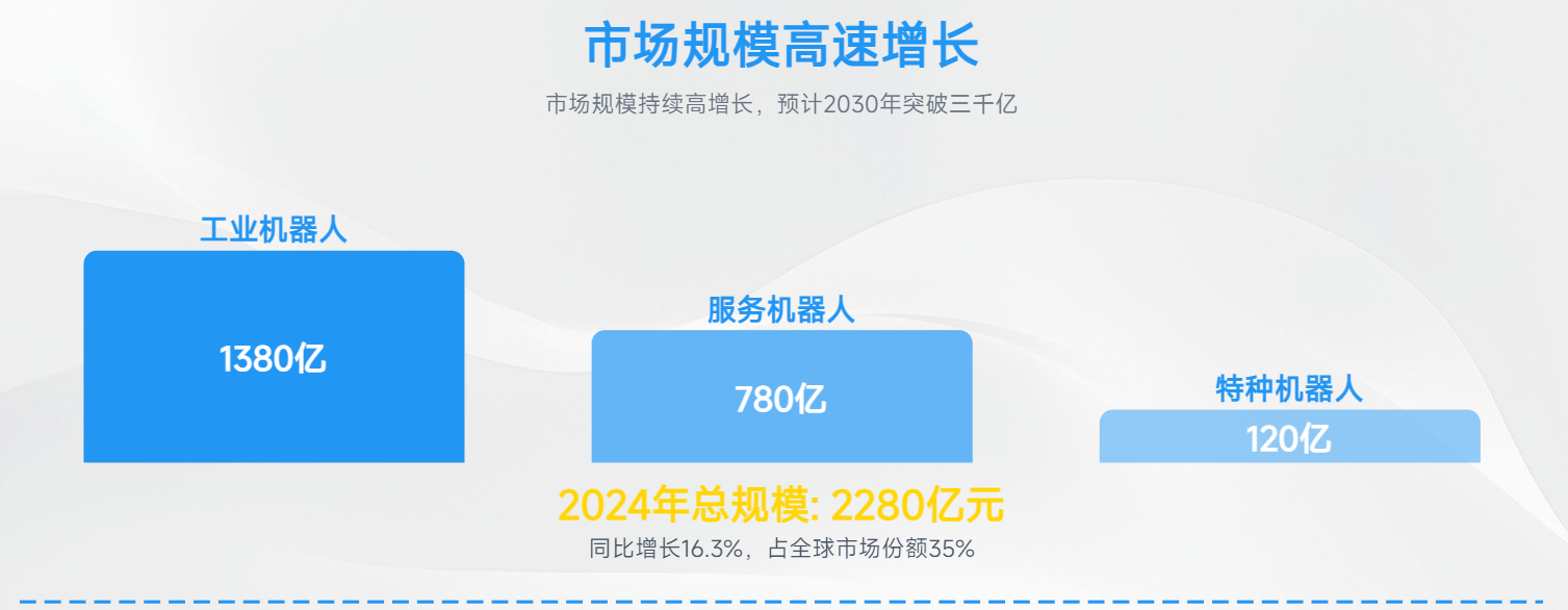 市场规模:2024年,中国机器人市场规模达到2280亿元人民币,同比增长16.3%,占全球市场份额的35%,连续12年位居全球第一。