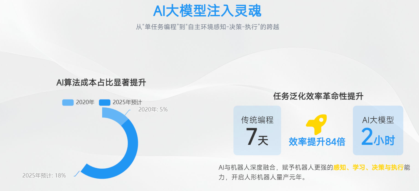 AI 与机器人的深度融合,赋予机器人更强的感知、学习、决策与执行能力,使得机器人实现从 "单任务编程" 到 "自主环境感知 - 决策 - 执行" 的跨越,任务泛化效率大幅提升。