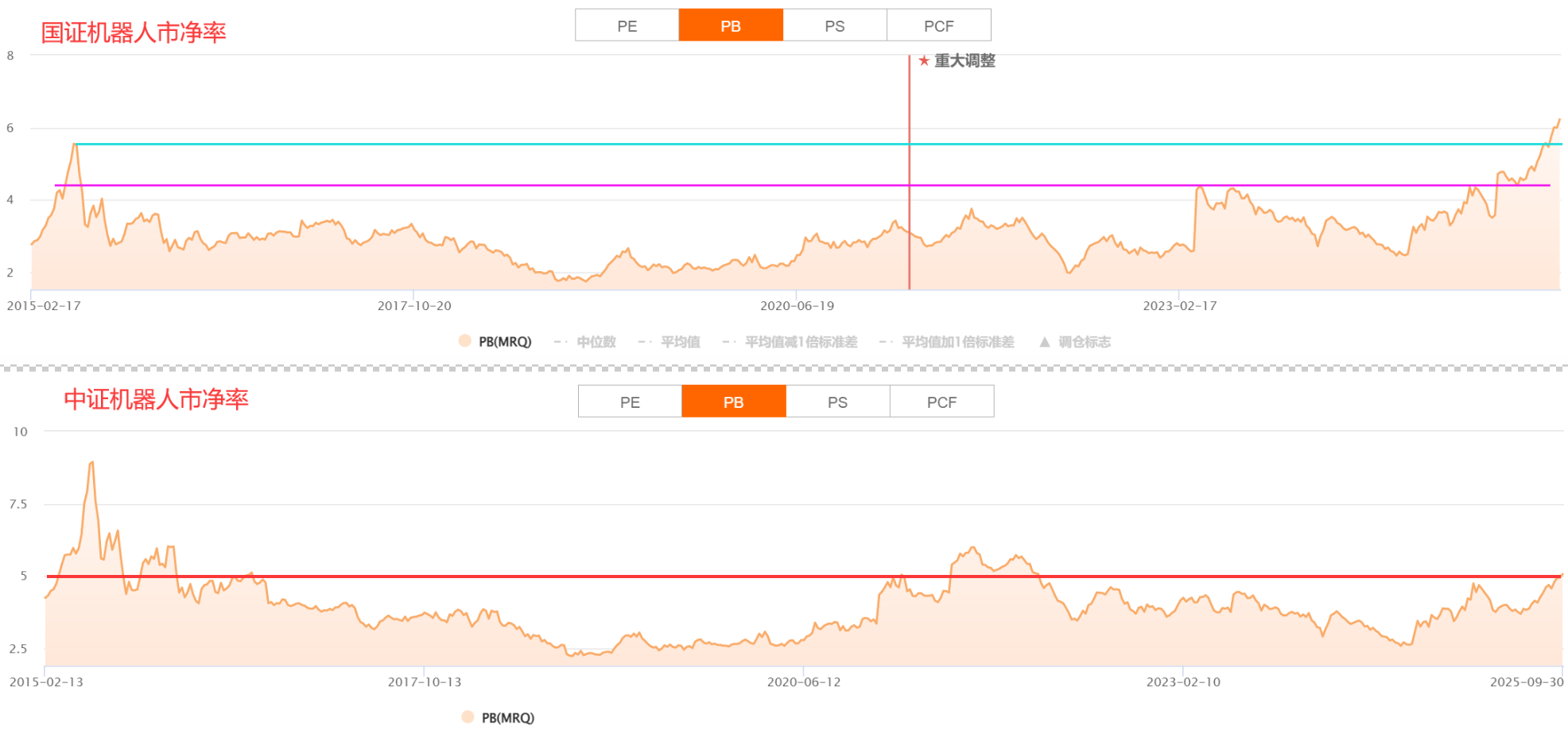 国证机器人PB为6.22,大幅超过了上轮牛市高点,也突破了2015年牛市高点;中证机器人PB为5.06,尚未突破上轮及2015年牛市高点。相比之下,中证机器人更具估值优势。