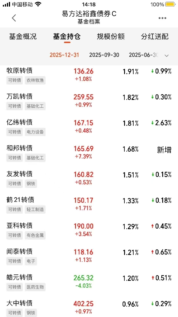 可转债回暖涨 1.25%,不过它的波动也大。这基小仓位配置了高评级转债,既不会因为转债波动太大影响净值,又能跟着喝点汤,这种 “小赌怡情” 的策略太适合稳健型投资者$易方达裕鑫债券A$ 加油$易方达裕鑫债券C$ 跟上