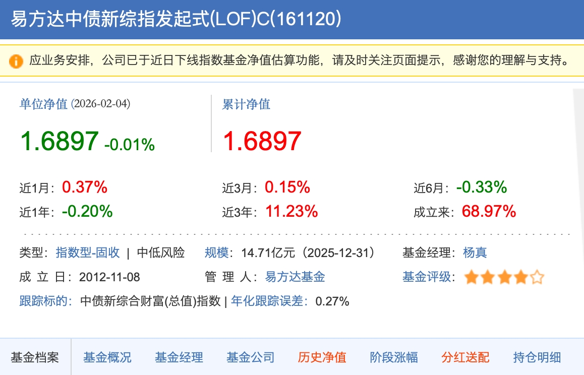 $易方达中债新综指发起式(LOF)A$ 不错$易方达中债新综指发起式(LOF)C$ 可以$易方达中债新综指发起式(LOF)D$ 添加