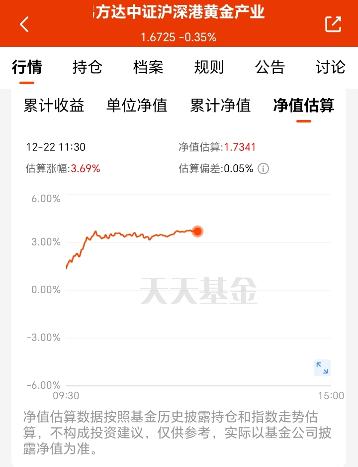 今天黄金行情延续火热势头,金银再创新高,看好黄金的长期价值成长逻辑呢。黄金股是金价放大器,自带杠杆久期,弹性更足,不少公司布局有色赛道,能跟上板块大行情。 $易方达中证沪深港黄金产业股票指数发起式A(OTCFUND|021362)$今日盘中估值涨幅3.69%,近半年涨33.78%、近一年内涨77.3%,比同类能打,我打算继续拿着啦。
