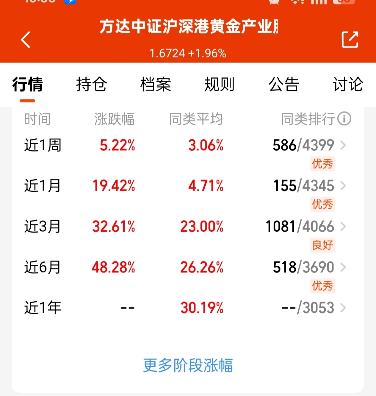 我发现黄金股有个特点,就是当金价上涨时,这些股票的涨幅往往会更大,就像带着"加速器"一样。最近我在关注$易方达中证沪深港黄金产业股票指数发起式C$ ,这只基金主要投资黄金行业的龙头企业。从近期表现看,它的涨幅确实比同类黄金主题基金更突出,既能把握上涨机会,又具备一定的防御性。