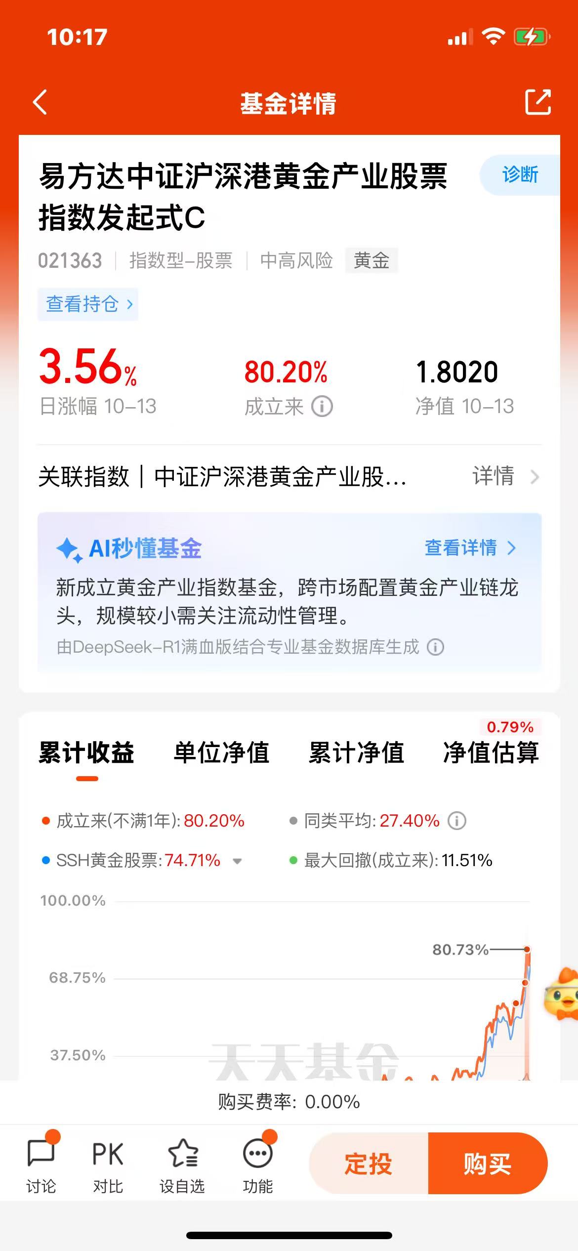 我上车的$易方达中证沪深港黄金产业股票指数发起式C(OTCFUND|021363)$黄金股短期业绩涨幅都比同类涨幅更强一些,也终于给我找到好的黄金主题基金。