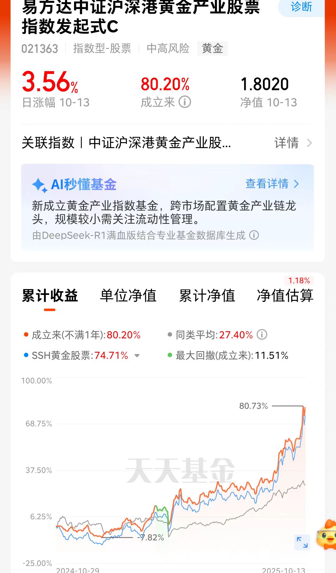 这两天股市震荡,小黄鱼可是势不可挡了,伦敦金再次突破关键点位,9月以来加速上行。牛市中黄金股的上涨弹性更大,黄金仍在强势周期;我持仓的$易方达中证沪深港黄金产业股票指数发起式C(OTCFUND|021363)$,昨天大涨3.56%,近一个月上涨13.27%,近三个月上涨44.81%,明显高于同类呢。