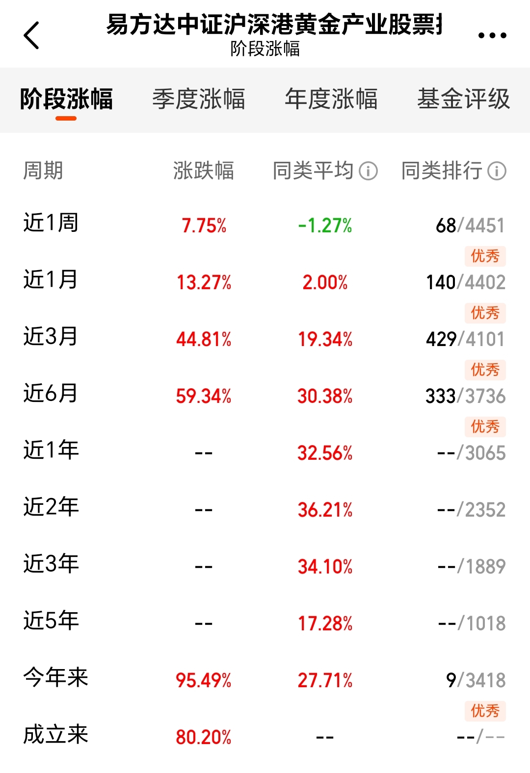 最近黄金市场热度挺高,美联储降息预期、全球央行持续购金这些利好撑着,伦敦金 9 月后一路突破关键点位,强势周期还在延续。要知道牛市里黄金股涨得比金价更有弹性,而$易方达中证沪深港黄金产业股票指数发起式C(OTCFUND|021363)$这段时间的短期业绩,对比同类产品确有优势,从黄金行情和产品表现看,是值得关注的一个方向呀。