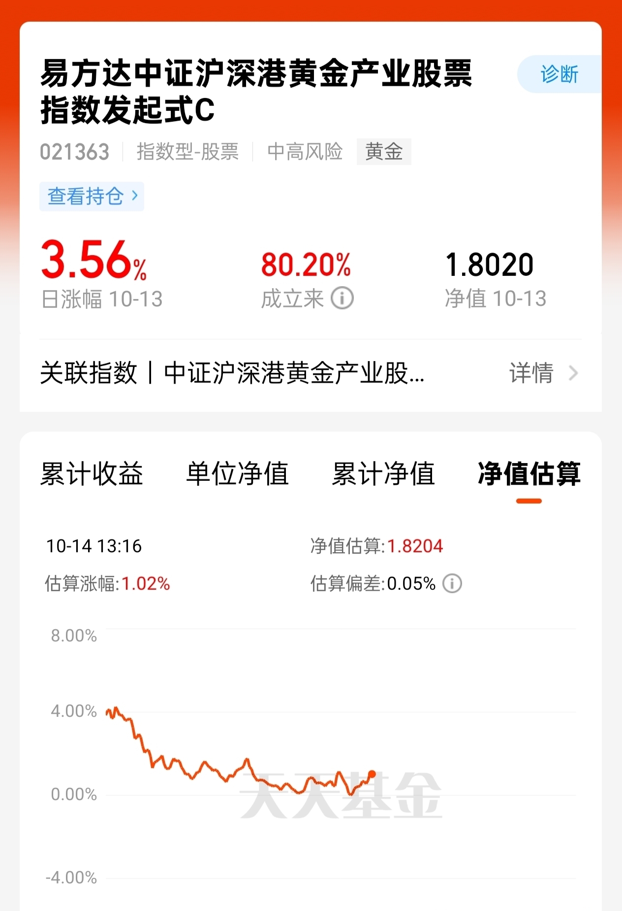 最近黄金价格涨得挺猛,伦敦金都冲到4169美元了,9月以来一直在往上走。我看好黄金这个方向,所以继续加仓$易方达中证沪深港黄金产业股票指数发起式C$ 。这只基金专门投资黄金产业链的公司,不碰黄金首饰这些消费类股票,近半年涨了59%,短期表现比同类产品好不少。