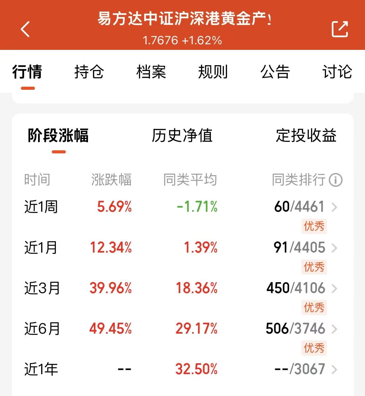 近期黄金真是太强了,屡破新高,而且眼下美联储还有降息预期,如今现货黄金都突破4200美元/盎司了,$易方达中证沪深港黄金产业股票指数发起式C(OTCFUND|021363)$是跨市场全链覆盖的,囊括沪深港三地黄金采掘、冶炼、销售的,近一个月涨幅12.4%,近三个月涨幅39.36%,业绩优秀,盈利强,我继续看好黄金啦!