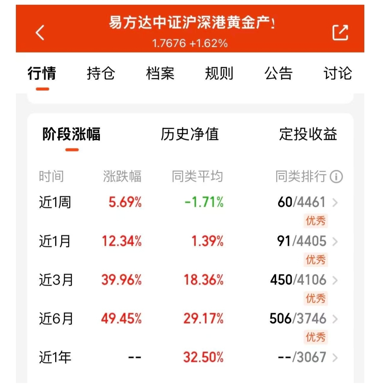 最近黄金涨得真猛,价格一路往上冲,连创新高。现在市场都在猜美联储可能要降息,金价更是蹭蹭往上涨,现货黄金都站上4200美元/盎司了。我关注的$易方达中证沪深港黄金产业股票指数发起式C$ 表现挺不错,这基金覆盖了A股、港股里挖金矿、炼黄金和卖黄金的公司。最近三个月涨了39.36%,上个月也有12.4%的涨幅,走势挺稳的。我觉得黄金行情还没走完,自己会继续拿着。