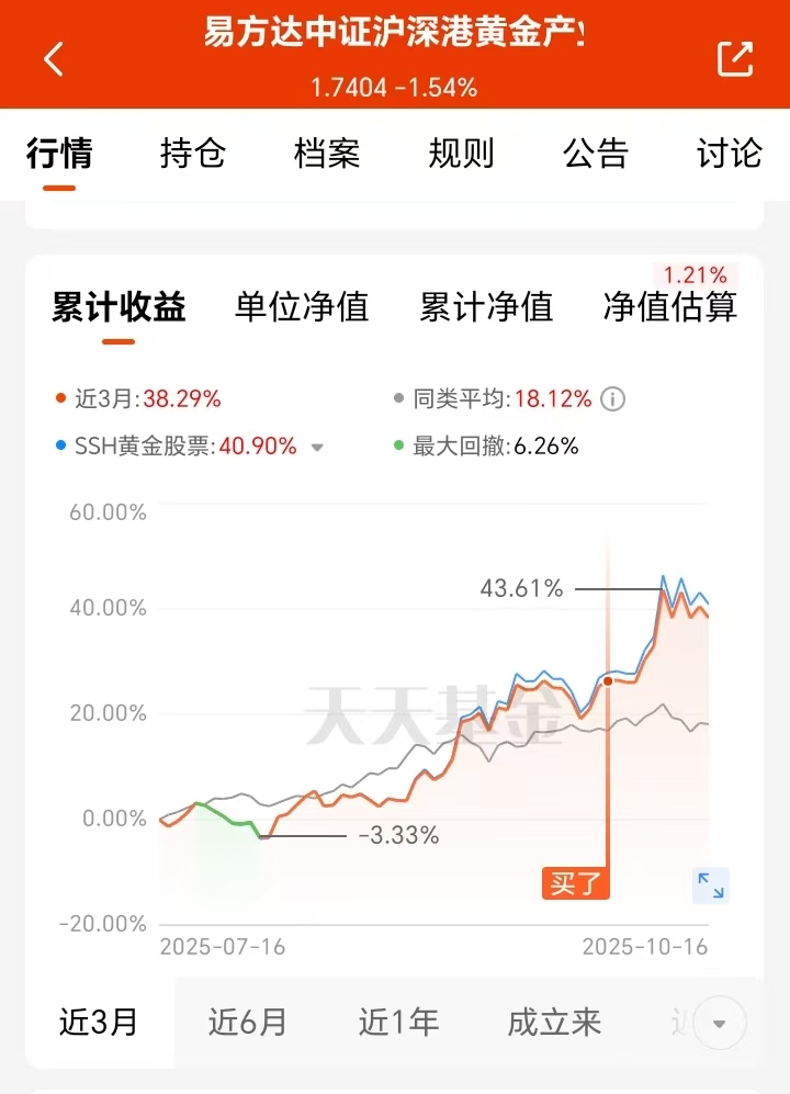 今天的黄金行情依旧火热,伦敦金表现给力,又突破关键点位,9月以来金价加速一路上行,现在明显还在强势周期里,暂也没半点降温的意思。其实,黄金牛市里黄金股才是“狠角”,是金价的放大器,上涨弹性比黄金本身大得多,行情也会随着金价上涨而启动。我拿着的$易方达中证沪深港黄金产业股票指数发起式C(OTCFUND|021363)$就是专投黄金产业股,近一个月涨幅10.7%,近三个月涨幅38.29%,短期业绩比同类产品都强,今天我也打算继续顺势加点仓了,得抓牢这波行情。#黄金突破4300美元!美银:明年5000#