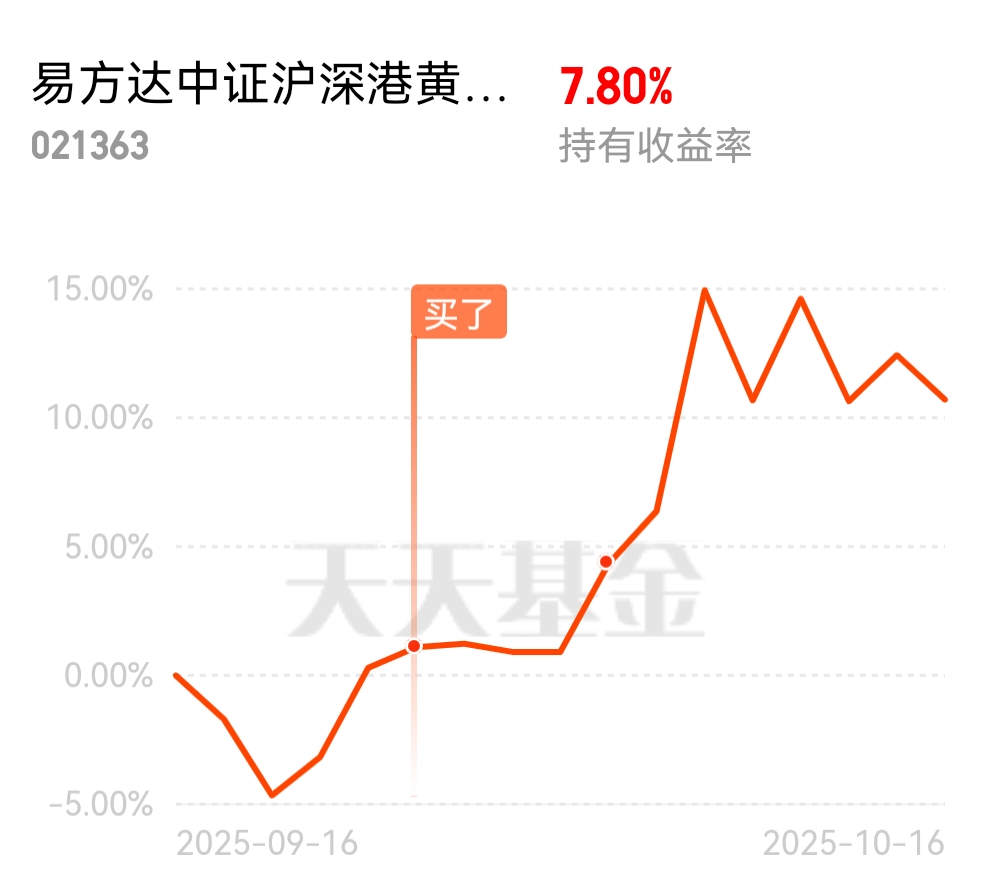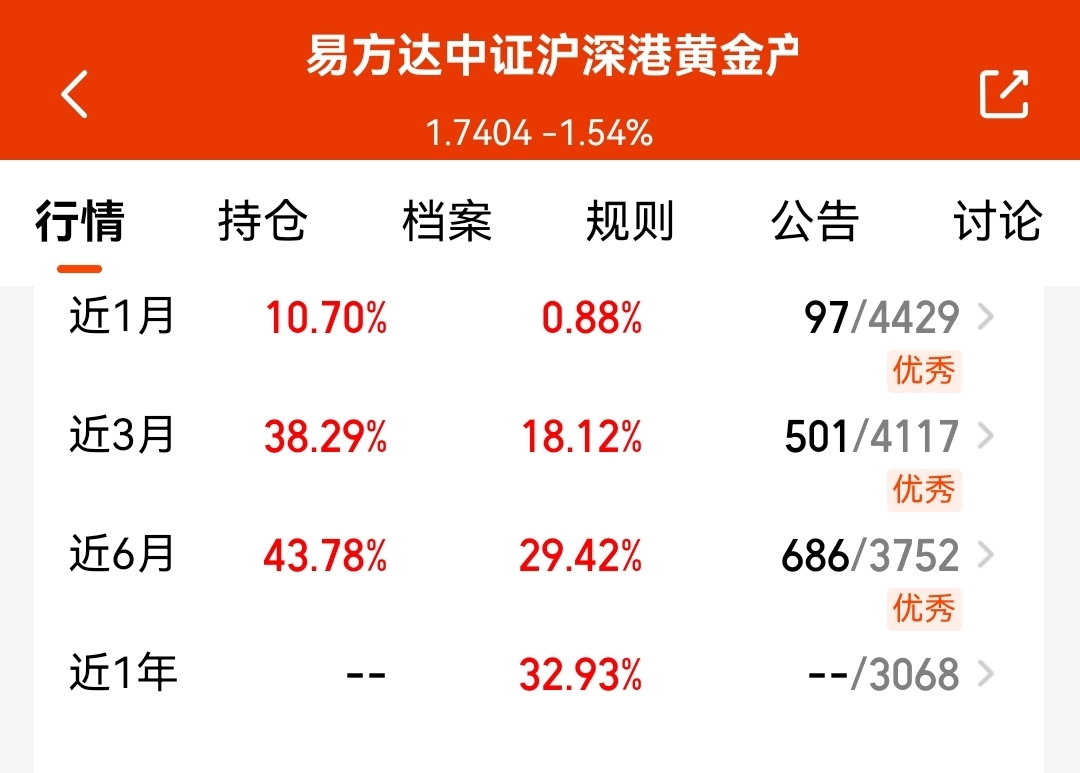 近期不确定性太多,我也继续加这支$易方达中证沪深港黄金产业股票指数发起式C$ ,持仓黄金板块,得益于国际金价新高,今天再次逆势大涨,近半年收益43.78%,黄金股作为金价放大器,行情也会随黄金价格上涨而启动;