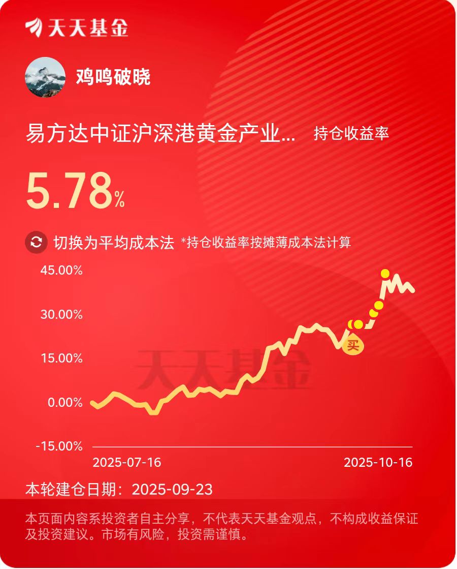 今天大盘指数低开低走,黑色星期五。但是黄金行情相对独立,尤其是黄金股可以说是金价放大器呢,行情也会随黄金价格上涨而启动,最近金价不断上涨,我也来加仓$易方达中证沪深港黄金产业股票指数发起式C(OTCFUND|021363)$持仓收益不错呢。