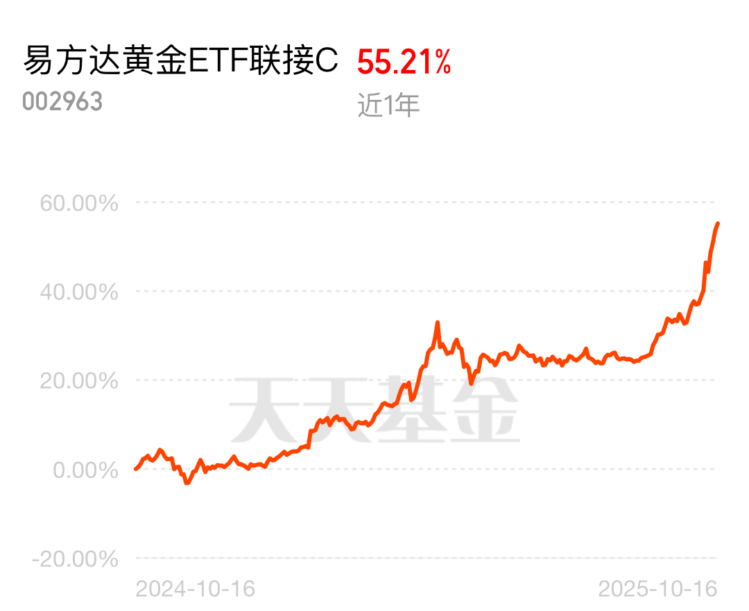 老铁们,黄金牛市来了!金价创今年最高涨幅,易方达黄金 ETF 联接 C 今天涨 3 个点,近一月 15.09%、近一年 55.21%,同业里优势明显,博弹性抓它。