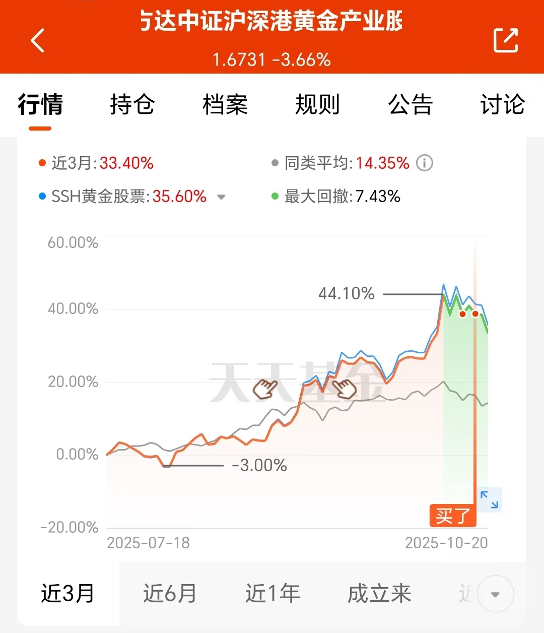 今日黄金暴力反弹一举突破新高,市场热度不减呀。自9月以来,金价在美联储降息预期、全球央行购金等因素推动下加速上行,强势周期明确。黄金牛市中,黄金股弹性远胜金价本身,实属是金价放大器。我持有的$易方达中证沪深港黄金产业股票指数发起式C(OTCFUND|021363)$专注黄金产业股,近三月上涨33.40%,短期业绩领先同类,趁着行情正盛,今日打算继续加仓,紧抓这波机遇。