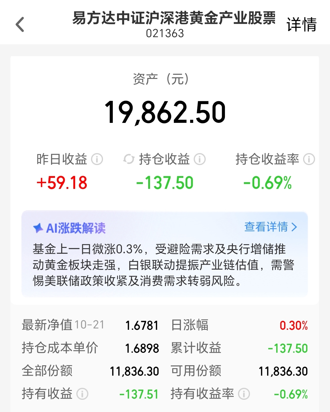 关注黄金赛道投资工具: 像$易方达中证沪深港黄金产业股票指数发起式C(OTCFUND|021363)$这样的基金,能够精准捕捉黄金股行情。它覆盖A股和港股优质黄金产业公司(如紫金矿业、山东黄金等),分散区域风险的同时,能更全面地把握整个黄金产业链的投资机会。