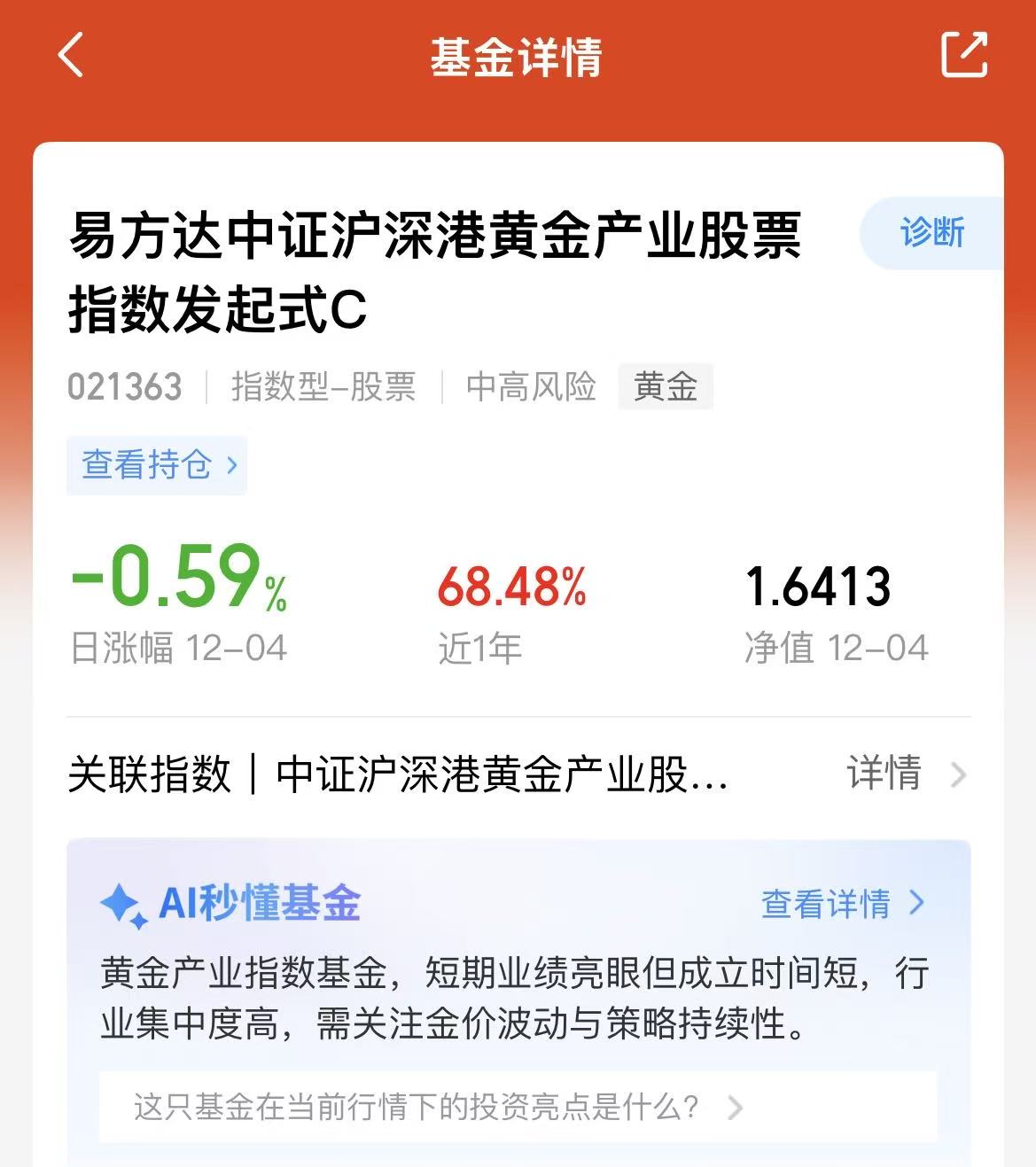 今天A股反弹回暖,黄金也迎来上涨啦,眼下美联储降息预期延续升温,央妈也持仓增持黄金,黄金还是继续看好的。黄金股是在黄金的基础上加杠杠和久期,相对来说更有弹性,$易方达中证沪深港黄金产业股票指数发起式C(OTCFUND|021363)$年化收益率68.48%,业绩也更加出色,我继续持仓待涨啦!#牛市旗手猛飙:短期反弹or趋势反转?##12月你看好哪条投资主线?#