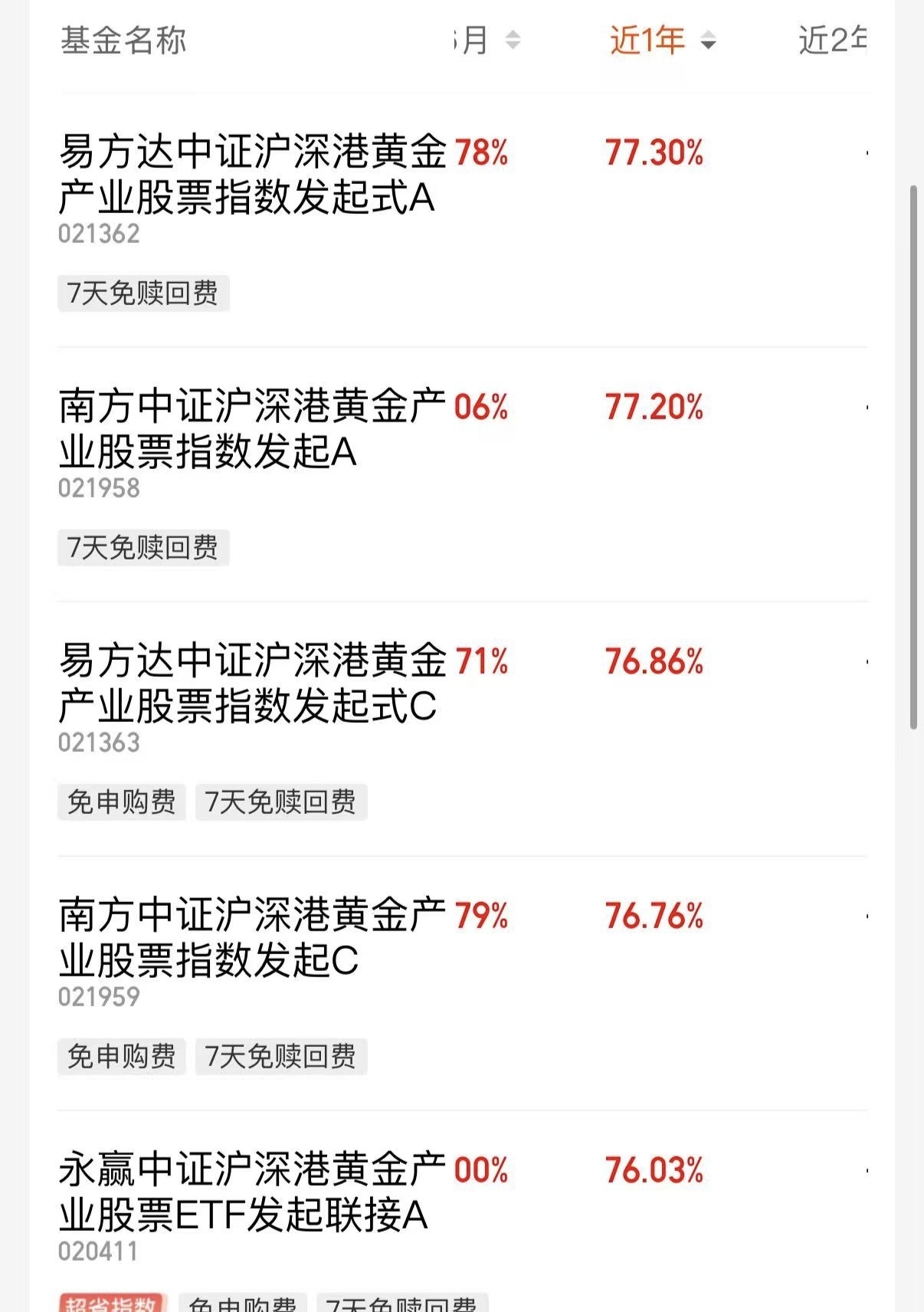 $易方达中证沪深港黄金产业股票指数发起式C$ 是聚焦黄金产业的指数基金。覆盖港深三地黄金龙头,长期稳定盈利的能力强。近一年涨幅76.76%。我看好未来的成长表现,$华安黄金ETF联接C$ $国泰黄金股ETF联接C$ #现货黄金创历史新高!你上车了吗?#