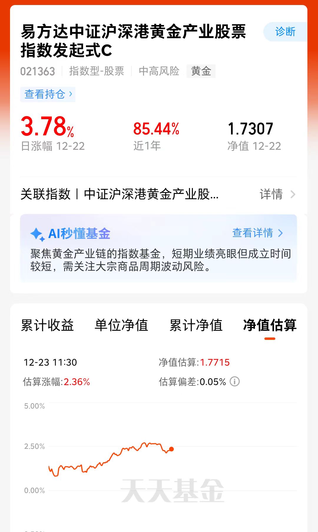 股市行情向好,金价上涨,年底行情不错啊,$易方达中证沪深港黄金产业股票指数发起式C(OTCFUND|021363)$聚焦黄金产业链,昨天上涨3.78%,今估值上涨2.36%,我感觉黄金股可以作为金价放大器,金价上行趋势下借助黄金股博取更高收益弹性。年底利好也比较多,可以参考上车布局了呢。
