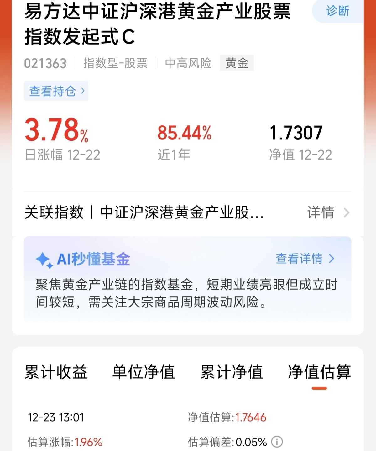 $易方达中证沪深港黄金产业股票指数发起式C$ 就是聚焦黄金产业的指数基金。紧密跟踪中证沪港深黄金产业指数,全面覆盖沪港深黄金产业链。昨天上涨了3.78%,近一年上涨了85.44%,紧跟指数的同时也跑赢了指数的涨幅。我看好基金在未来黄金产业中的收益表现。期待继续创新高。