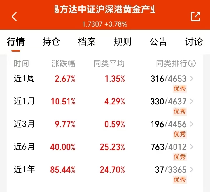黄金行情彻底燃起来了!现货价突破关键点位再攀新高,9月至今一路表现强势呢。在我看来,黄金股是金价的放大器,自带杠杆和久期buff,在金价持续上行趋势下能博取更高的收益。$易方达中证沪深港黄金产业股票指数发起式C(OTCFUND|021363)$表现也很给力,近一年大涨85.44% 甩同类一大截,我打算继续拿着,坐等吃肉!