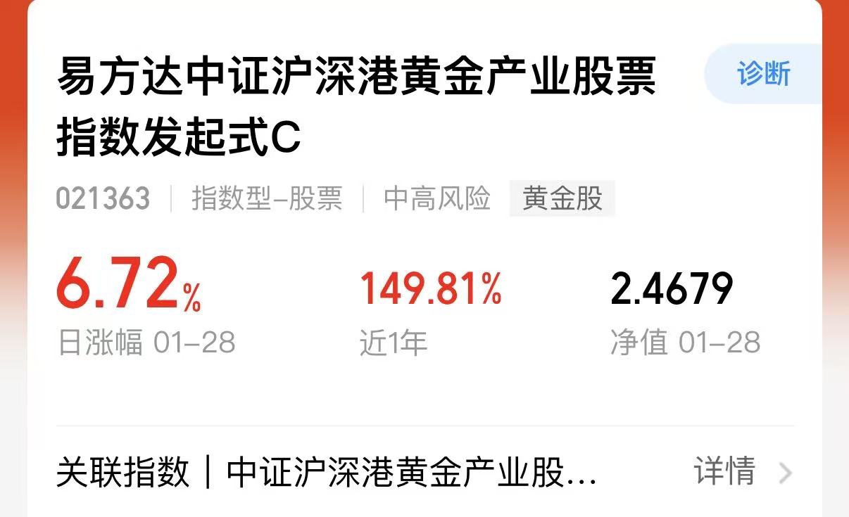今天的行情真是给力,贵金属板块全线飘红!我关注的易方达中证沪港深黄金今天表现太亮眼,单日涨幅直接冲到了6%以上。看着紫金矿业、山东黄金这些权重股都在发力,感觉这波牛市的红利是吃定了呀