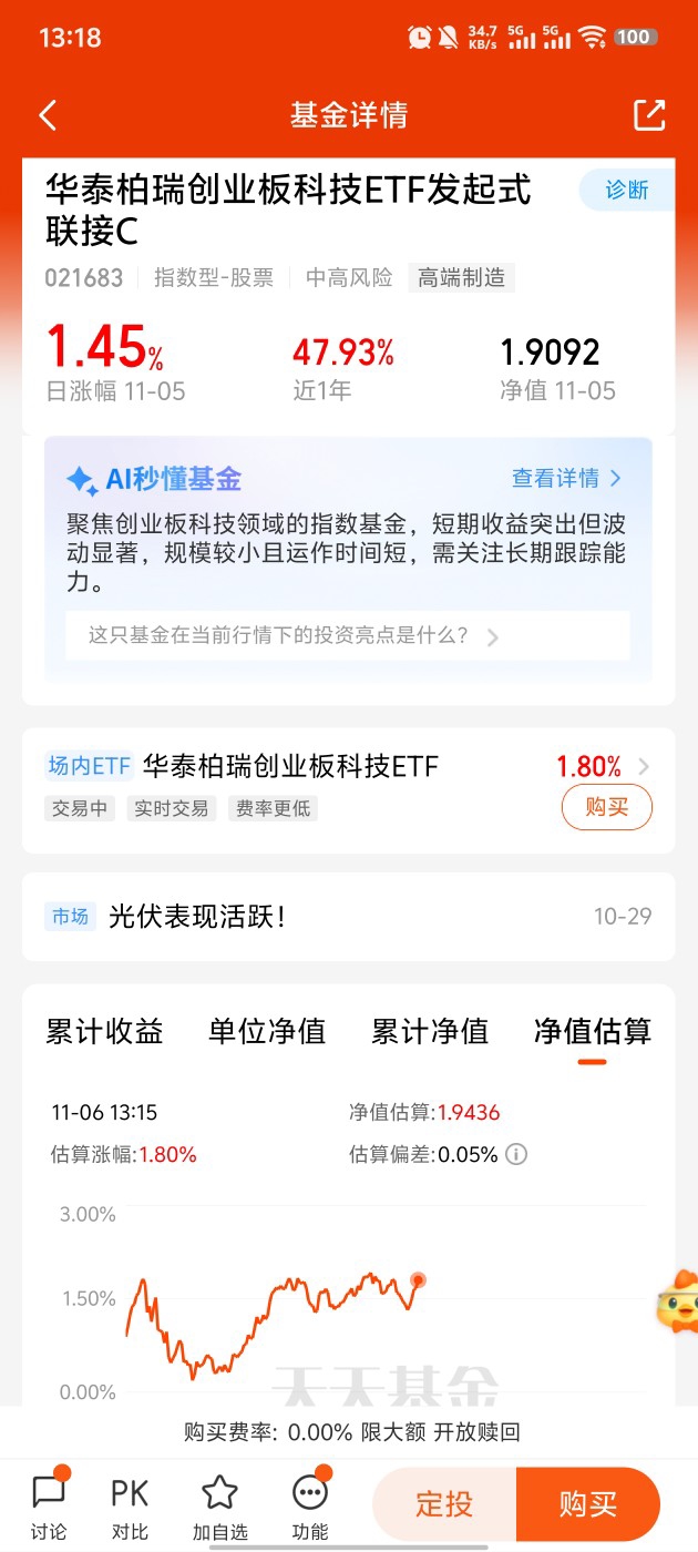 关注创业板的朋友应该感受到了,近期板块慢慢有回暖迹象,今天更是低开高走涨超1%,资金进场的信号很强烈。现在创业板的估值处于历史低位,安全边际很高,而且盈利增速保持在不错的水平,基本面扎实。加上政策持续加码,深化创业板改革、构建科技金融体制,长期利好不断。创业板里的科技公司涵盖了AI、低空经济、未来信息等多个前沿领域,都是未来的大趋势。想参与这个赛道,华泰柏瑞是个靠谱的选择,它跟踪创业板科技相关指数,管理团队经验丰富,跟踪误差小,能精准把握板块行情。C类份额场外申购方便,不用盯盘,适合没时间操作的朋友,支持定投,能平摊风险,趁现在行情启动,布局性价比很高,投资有风险,理性看待波动就好~