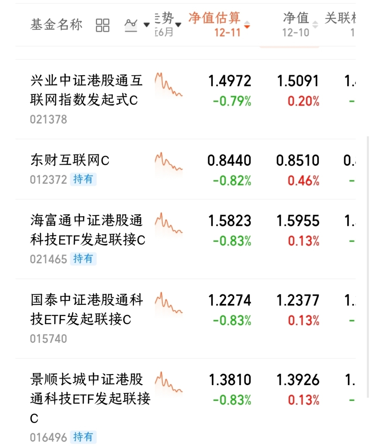 市场今天冲高回落,多数板块出现回调。目前港股处于相对低位,其中互联网板块弹性较大,特别是重仓阿里巴巴等龙头的兴业中证港股通互联网指数发起式C,反弹时往往表现更突出。现在估值下跌0.79%,主要是受大盘拖累,反而提供了不错的布局机会。这只指数基金费率也较低,比较划算。另外,东财互联网C和国泰中证港股通科技ETF联接C也分别回调了0.82%和0.83%,港股科技板块整体调整后,配置价值逐步显现。