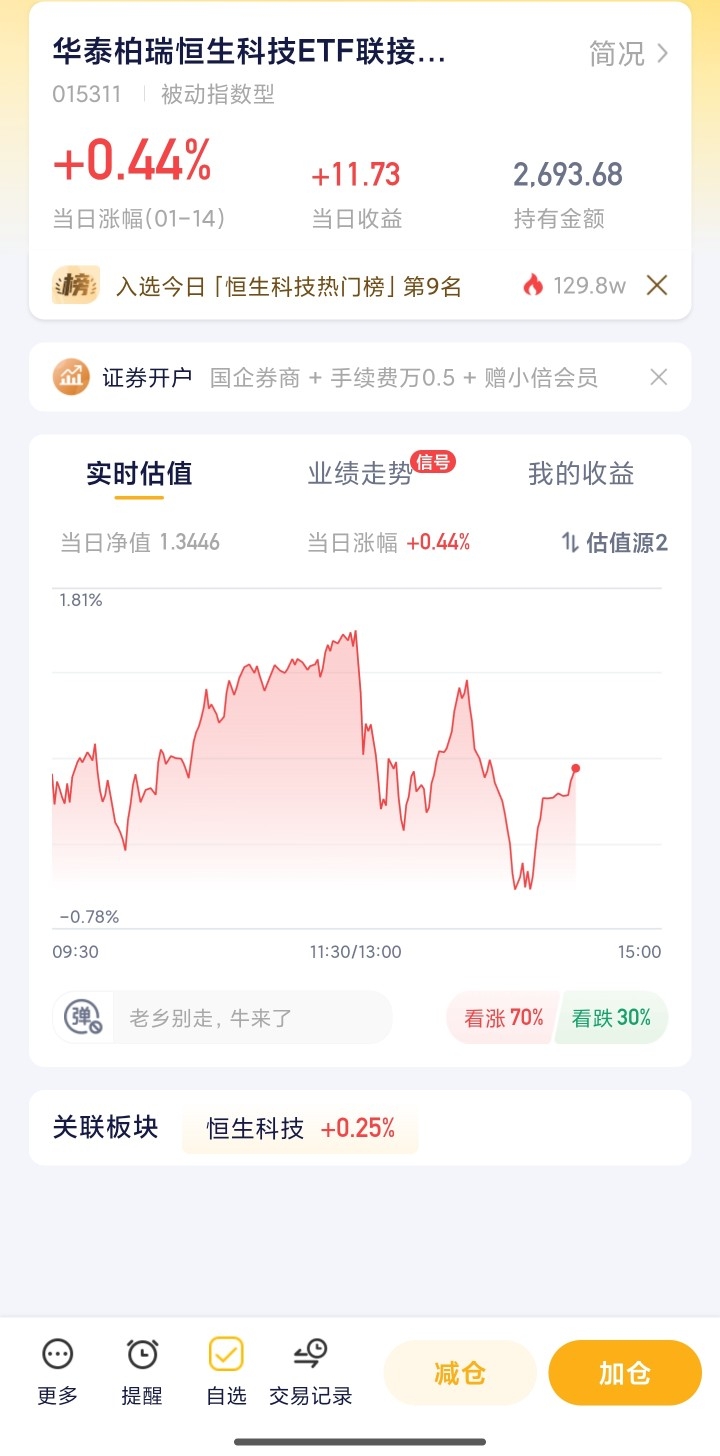 今儿恒生科技指数的表现真没让人失望,高开探底后直接震荡拉升,午盘涨1.54%,恒生指数也跟着涨了0.92%重回27000点,港股整体的赚钱效应慢慢回来了!细看盘面,科技股阵营里分化不大,大部分核心标的都在上涨,AI应用概念股更是集体飙升,这也印证了科技赛道尤其是人工智能这条线,未来的想象空间还是很大的。很多人想抓住科技股的机会,但又怕自己选不好股,毕竟港股个股波动有时候比A股还大,踩错节奏就容易亏。其实咱们普通人想布局恒生科技,不用非得买个股,华泰柏瑞的产品就很适配,它主要就是投资对应ETF跟踪指数,能精准跟上板块涨跌,不会错过整体行情,而且运作费率很低,长期持有成本不高,风险也比单买个股小,对于没时间盯盘、想省心分享科技红利的朋友来说,这种跟着指数走的产品真的很合适。$华泰柏瑞恒生科技ETF联接(QDII)C$