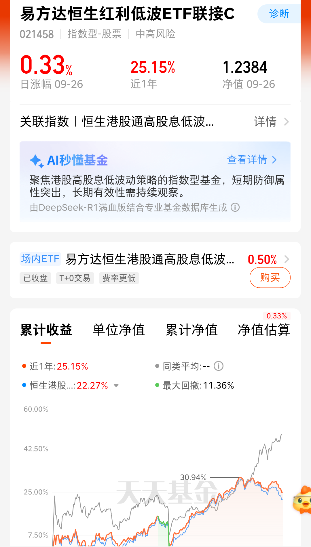 今天股市震荡,看来配置防守型资产还是很有必要的,而红利资产防御能力强,就比较适合,而且港股红利较A股红利弹性更大、股息率更高。我就是关注到了$易方达恒生红利低波ETF联接C(OTCFUND|021458)$,今天上涨0.33%, 近一年上涨25.15% ,适合做防御配置。
