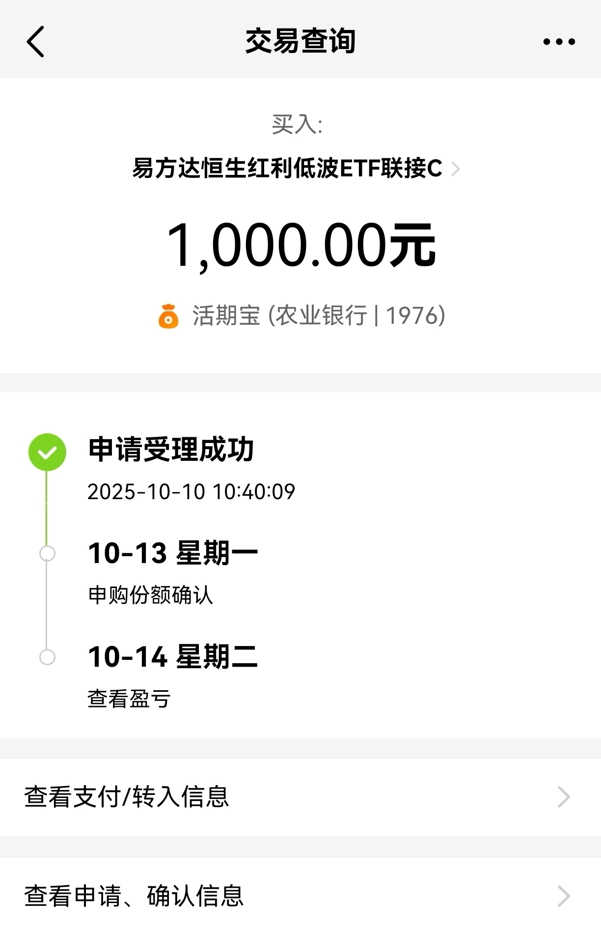 市场进入调整行情,其中科技特别惨烈,大跌3%,看来也不能一味的追涨了,现在有必要进行下防守了,科技主线低吸之余,咱保持一定仓位的红利,今天加1000元$易方达恒生红利低波ETF联接C$ 港股恒生红利,美联储降息背景下,港股整体更有机会,港股红利较A股红利弹性也更大, 防御性也更强,非常适合震荡市,一定不要错过了。