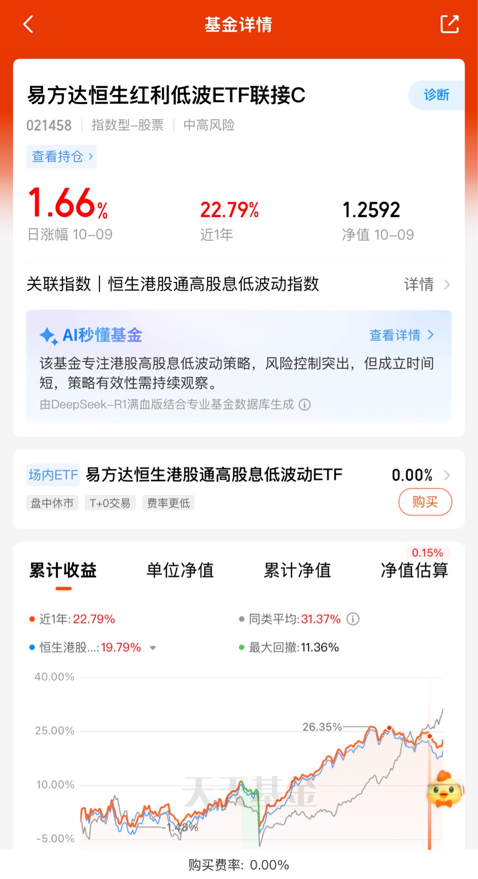 $易方达恒生红利低波ETF联接C$ 紧密跟踪港股优质高股息、低波动企业。