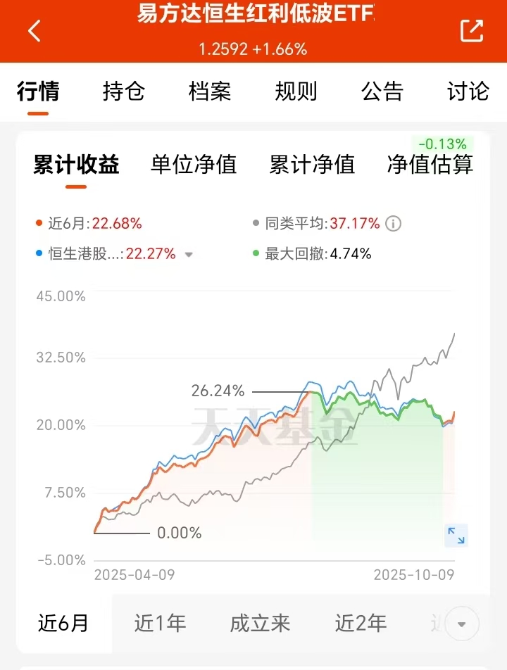 美联储降息预期升温,港股整体机会更足,港股红利弹性还比 A 股大。$易方达恒生红利低波ETF联接C(OTCFUND|021458)$聚焦港股高股息低波标的,抗跌又能拿息,近6个月上涨22.68%,业绩也不错,我觉得挺适配当下配置需求的。