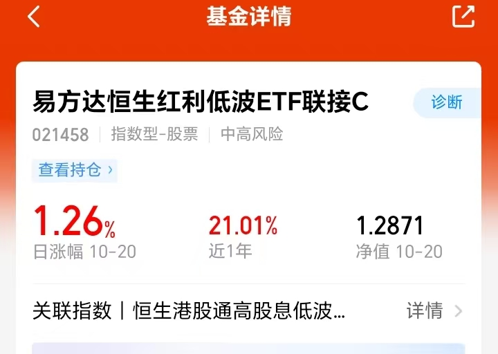 $易方达恒生红利低波ETF联接C(OTCFUND|021458)$紧密跟踪港股高股息资产的指数,今天涨1.26%,在低利率环境下,红利板块值得配置呀,而且港股红利较A股的弹性回更大,作为底仓配备一定的仓位,做好防守端还是很有必要的。