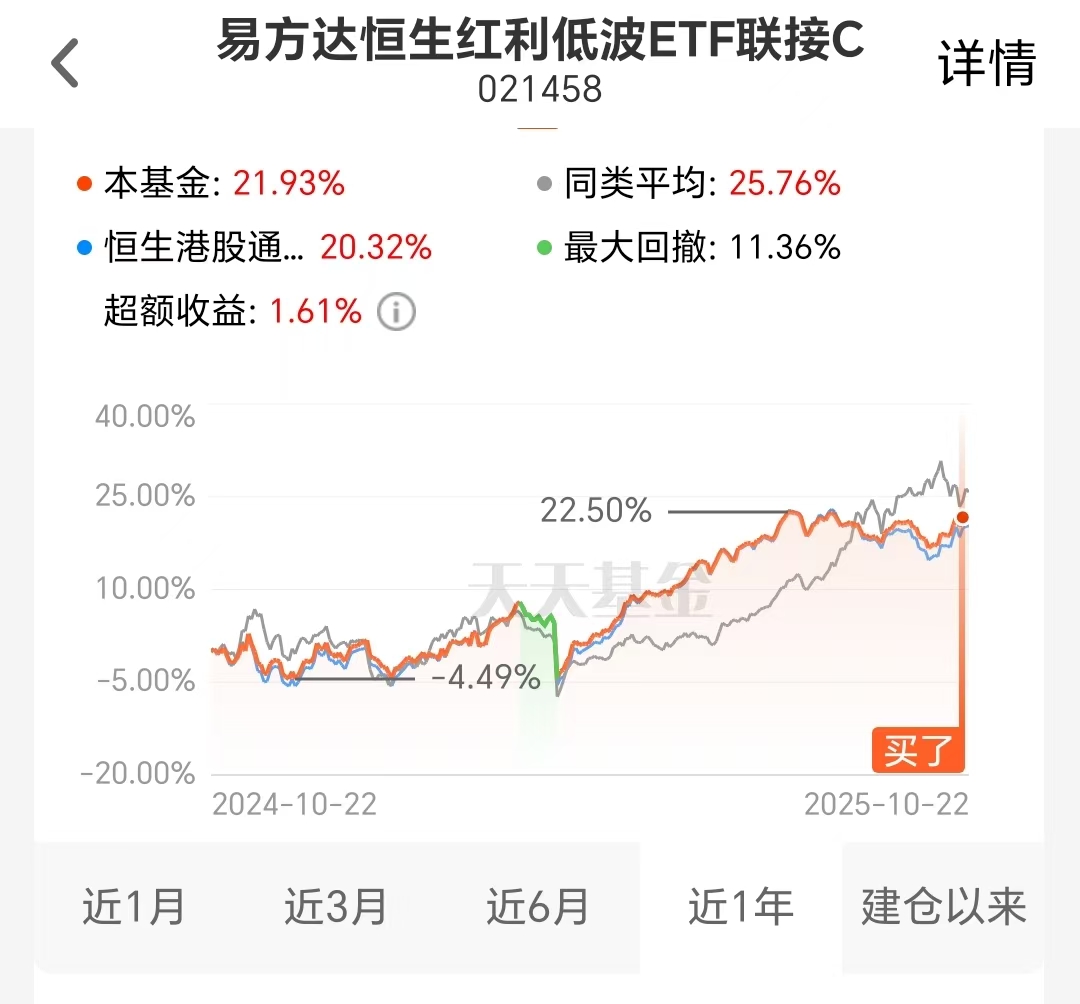 最近 A 股、港股一开盘就往下走,接着来回震荡,只抱科技一条线越来越心慌。我留了部分仓位给红利资产打底,毕竟现在美联储可能要降息,港股机会比 A 股多,红利类弹性也更大。港股高股息、波动小的$易方达恒生红利低波ETF联接C(OTCFUND|021458)$,既能扛住跌势拿分红,还有红利税优势,这样配置起来总算踏实点了。