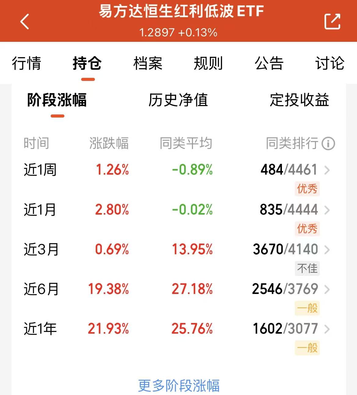 今天A股和港股震荡下跌调整,上涨的个股比较少,平常心对待吧,不过波动这么大情况下,防守资产还是不错的,红利板块我就比较喜欢,$易方达恒生红利低波ETF联接C(OTCFUND|021458)$我的持有收益率1.6%了,今天继续上涨吃肉,覆盖地产、金融等领域,美联储降息背景下,我觉得港股市场更有机会,港红利弹性也大,我继续持仓待涨了!
