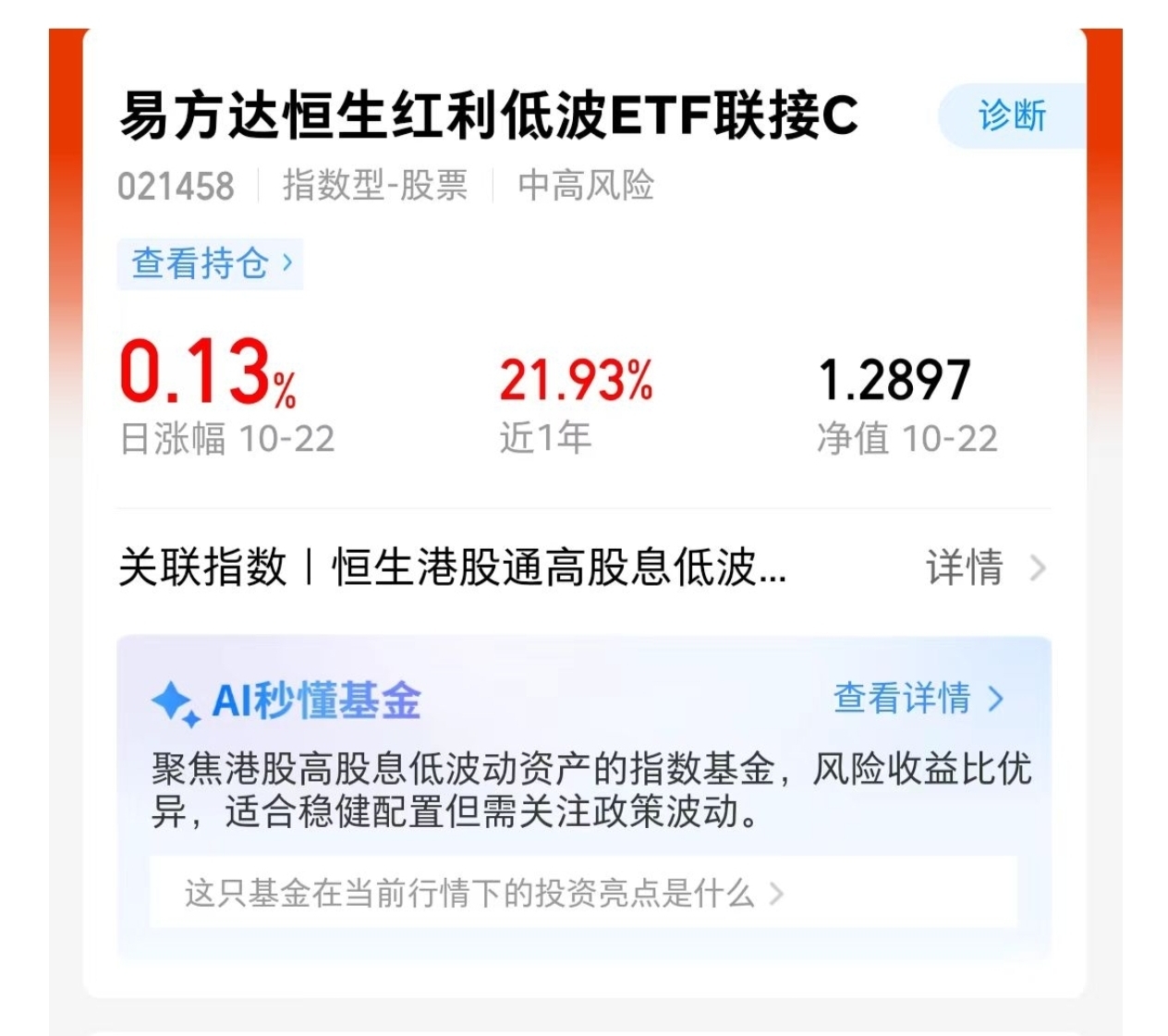 最近市场波动明显加大,成交量也在萎缩,感觉资金风格可能正在调整。这种行情下,我觉得配置些稳健型的资产挺有必要。港股市场在美联储可能降息的背景下,整体机会比A股更值得关注,特别是港股红利指数,波动弹性通常更大一些。我自己就配置了易方达恒生红利低波ETF联接C(021458),这类产品在震荡市中能提供不错的防御性。虽然不指望短期爆发,但长期来看,稳定的分红和低波动特性,在当前市场环境下还是挺有吸引力的。