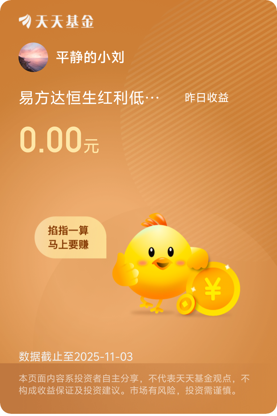 11月开启,大盘低开高走,轮动太快,我继续配置点$易方达恒生红利低波ETF联接C$ 做为防御,嘎嘎吃肉了,回撤小,修复快,尤其在最近调整过后,性价比很高,现在资金面偏紧,红利更香一点,特别港股市场,恒生红利较A股红利弹性更大些,我就拿着继续等修复了,继续看好接下来的表现#晒收益#