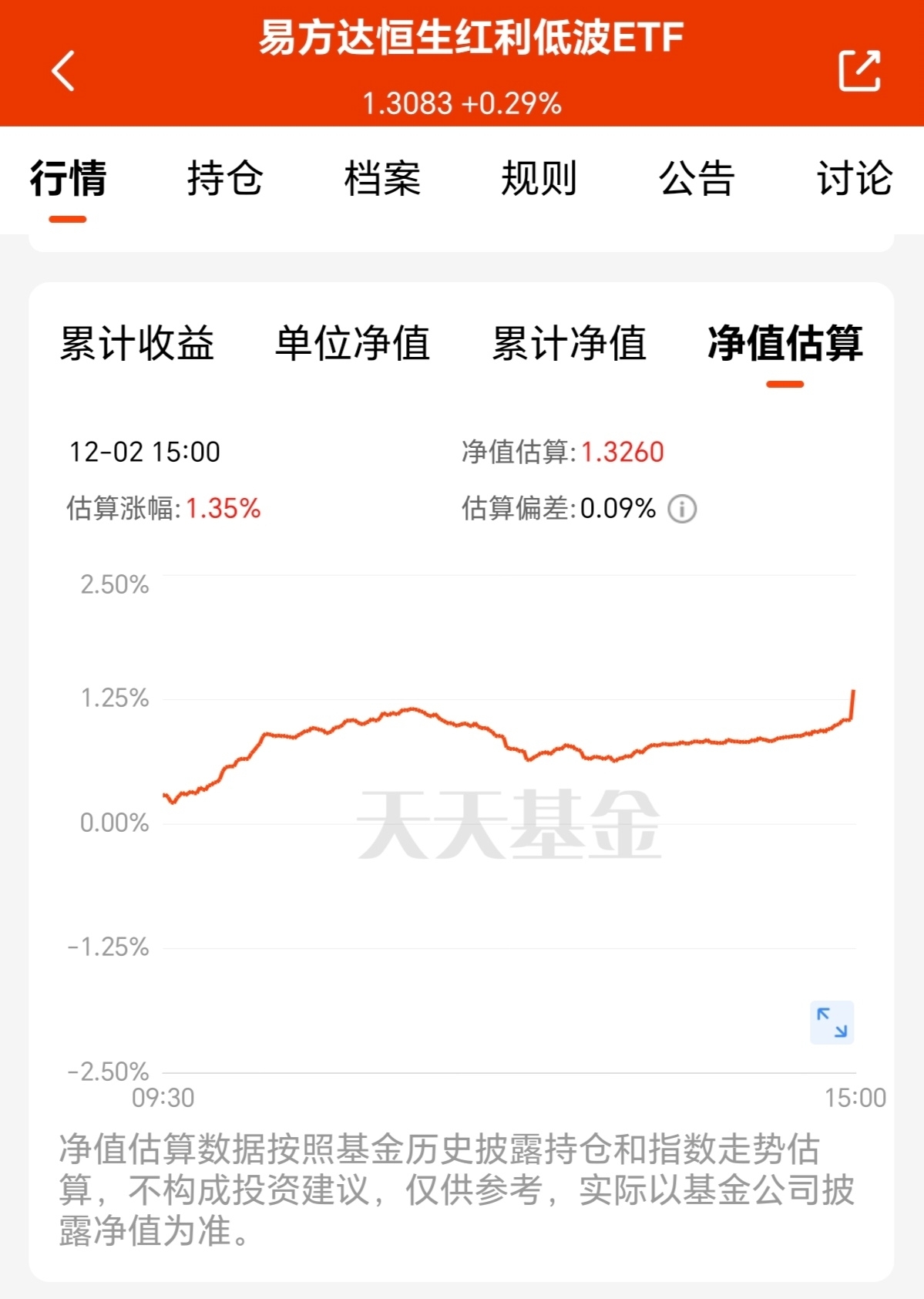 今日A股,港股两市都呈现震荡趋势,从盘面来看,科技板块有所回调,而红利板块再次逆势上涨,同时$易方达恒生红利低波ETF联接C$ 聚焦港股红利,实时估值涨幅远远领先A股红利,并且当下市场偏好开始下降,防御型的红利板块,会更受到市场资金青睐,我也将长期看好这一赛道了!