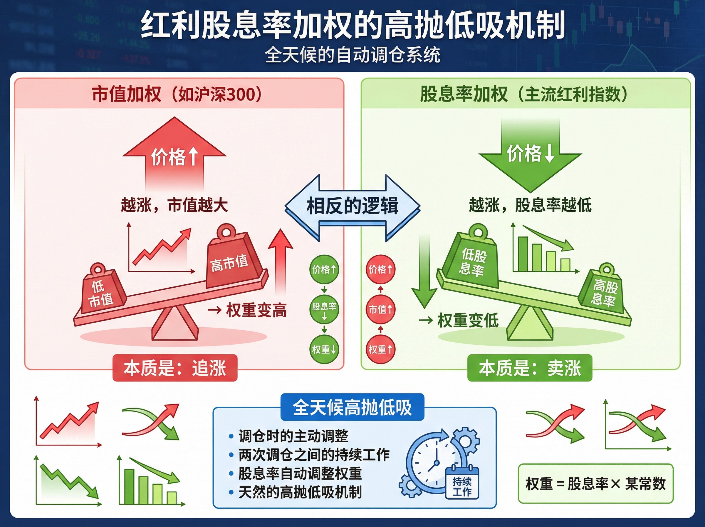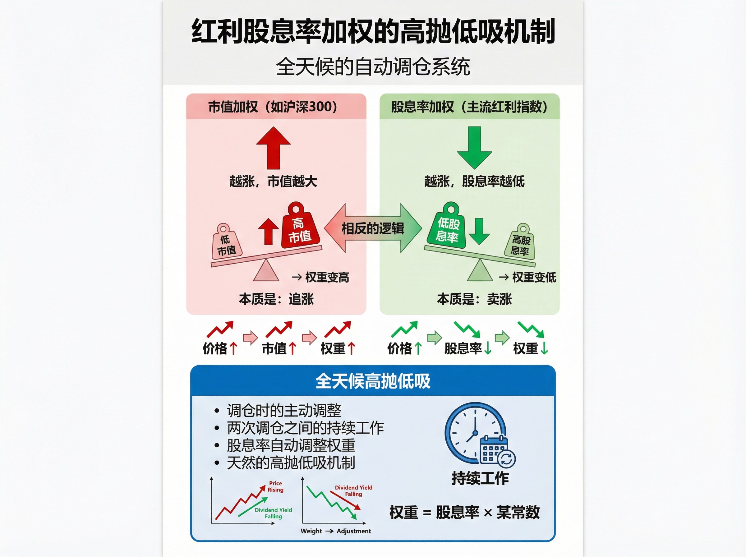 你想啊,市值加权是啥?是越涨,市值越大,在指数里分量越重,这叫“追涨”。而红利指数用的股息率加权呢?是股价越涨,股息率就越被稀释,它在指数里的权重自动就降了,这叫“卖涨”。反过来也一样,股价跌了,股息率显得更高,权重自动就提升了,这叫“买跌”。你就说这设计绝不绝?它让整个指数在两次大调仓之间,自己就在那默默地、持续地“卖贵买贱”。
