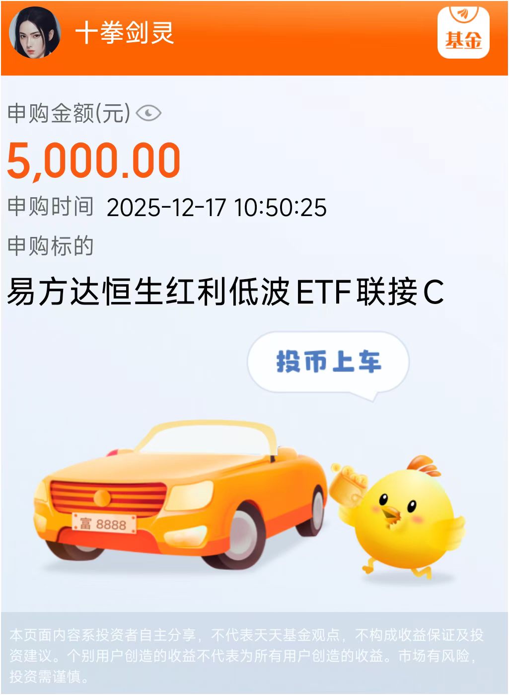 今天又买了5000$易方达恒生红利低波ETF联接C(OTCFUND|021458)$到“十拳剑之中波实验”这个300万公开实盘 。这动作熟得,跟给自己倒杯白开水一样。