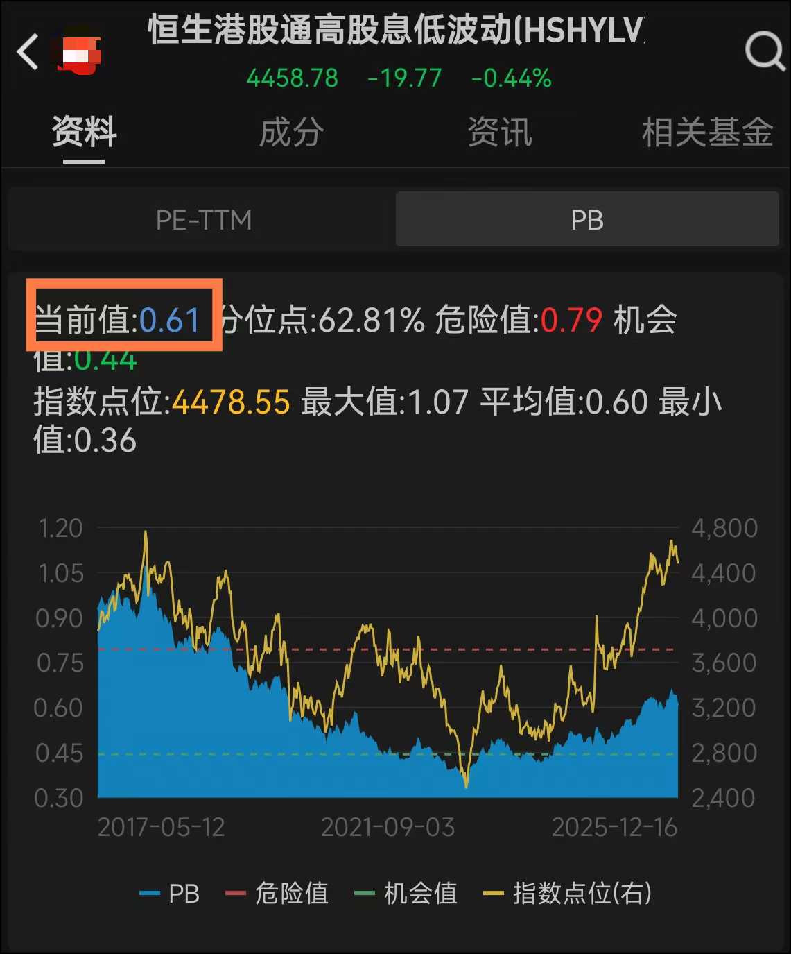 我买的这只基金,跟踪的是“恒生港股通高股息低波动指数”。它现在的市净率(PB)只有0.61倍。“破净”了——市场给这些公司的定价,比它们账面上的净资产还便宜一大截。好比理论上值1块钱的实在家当,现在只标价6毛1分钱卖。