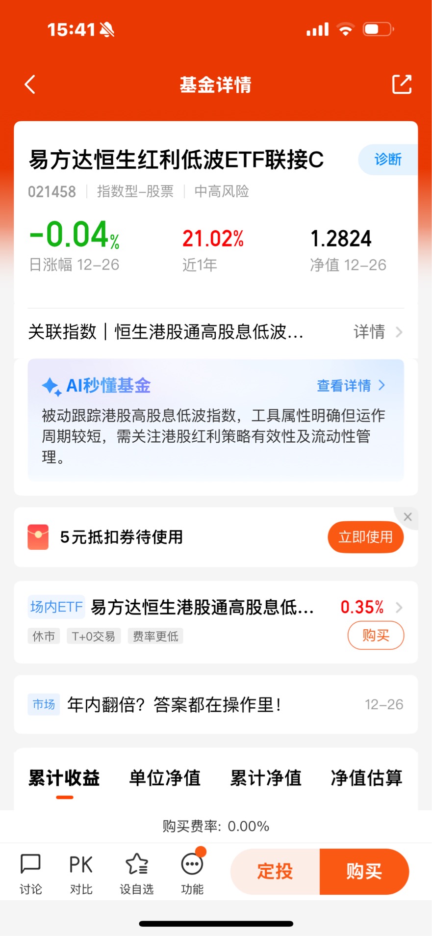 #我的年度投资操作#我最得意的操作:锚定$易方达恒生红利低波ETF联接A$,在低利率时代拥抱确定性价值