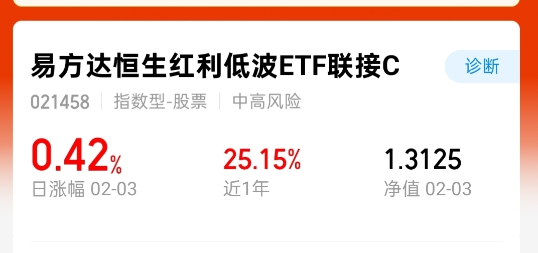 易方达恒生红利低波联接C,周二涨0.42%,近一年涨超25%,跟踪的恒生港股通高股息低波动指数成分股平均股息率超6.5%,远高于A股主流红利指数,政策推动长期资金配置高股息资产,低利率环境下,稳健配置不错的。