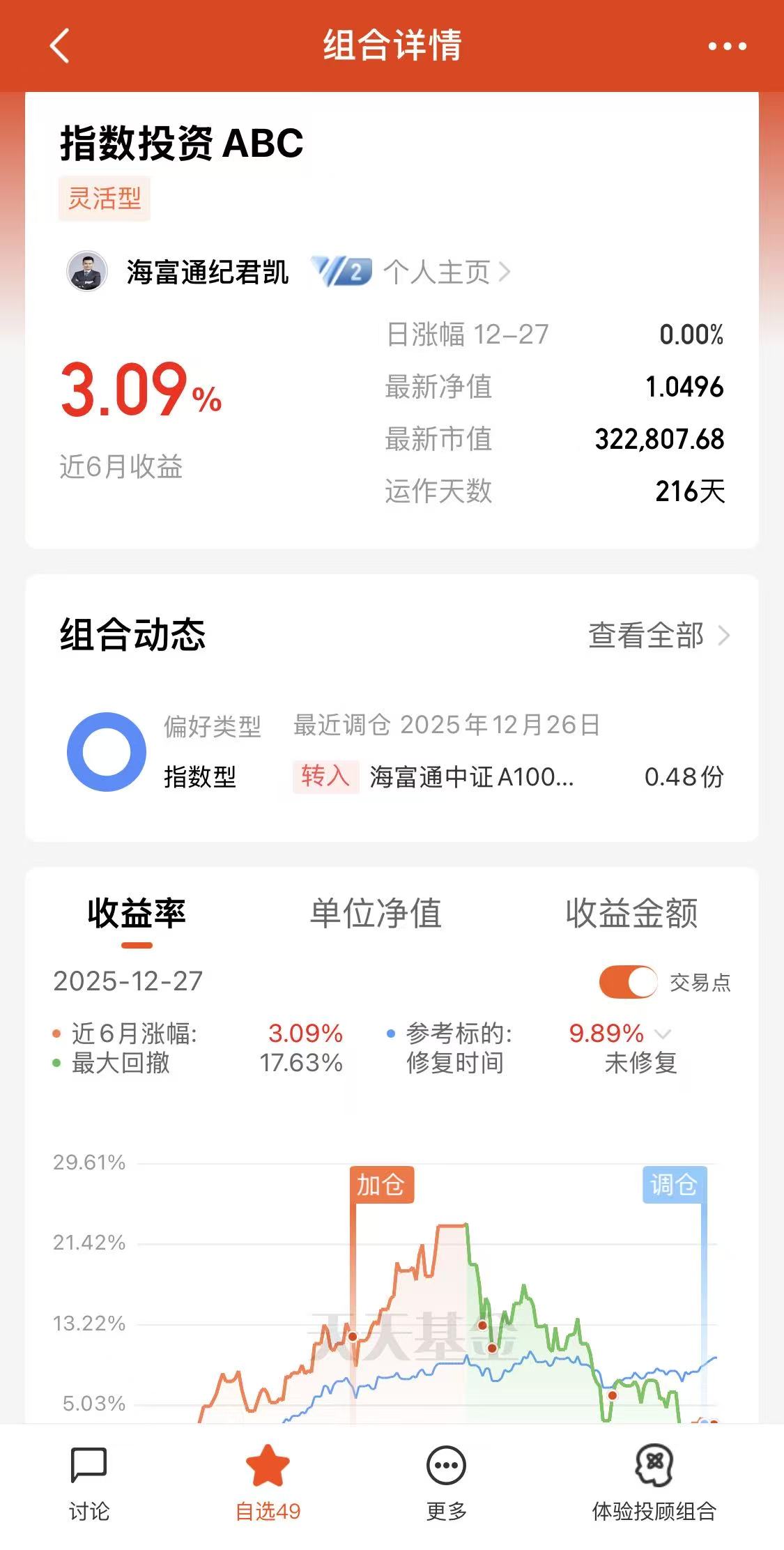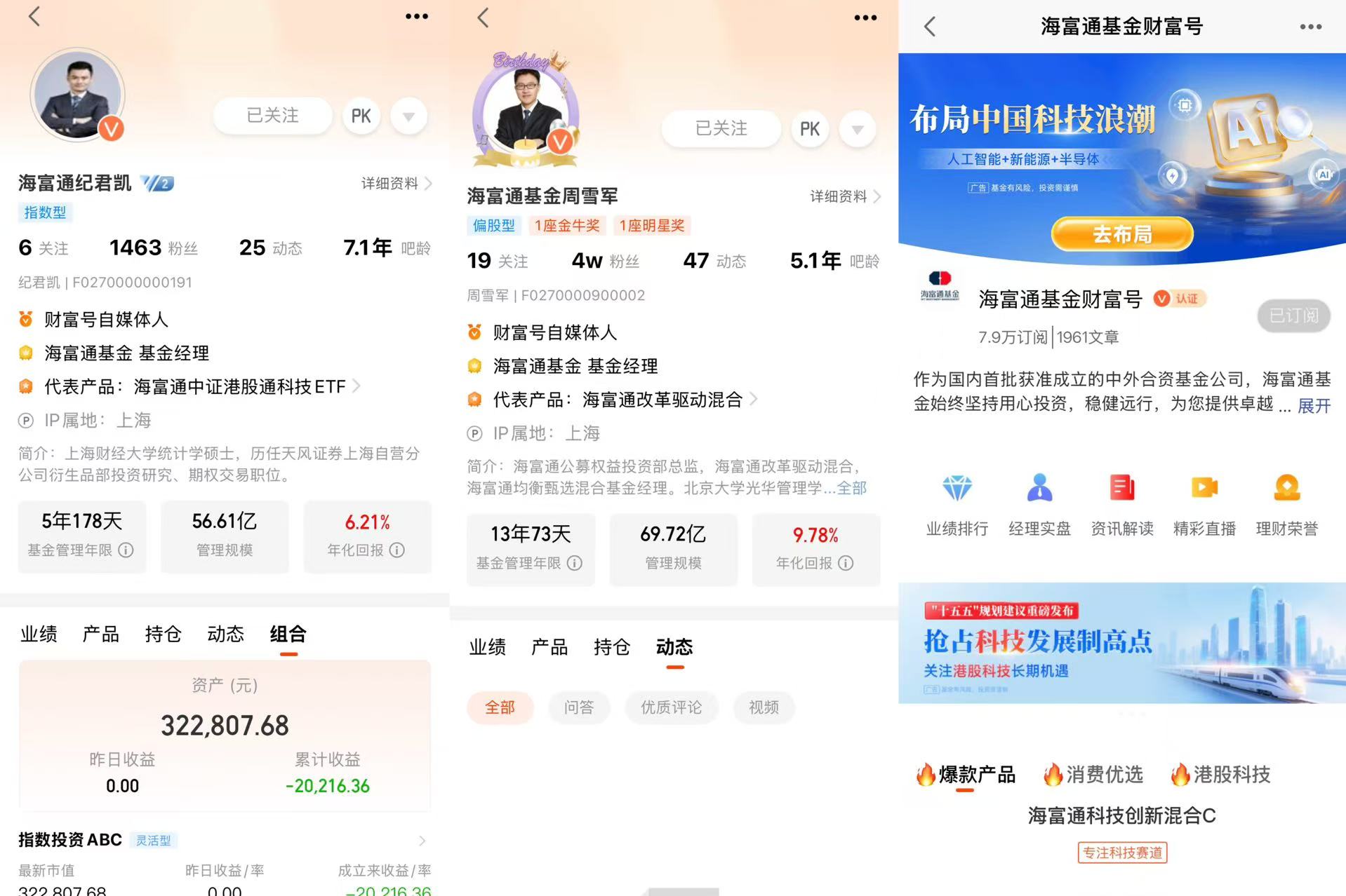 首先,我非常支持本次天天基金网的“基金经理开实盘”活动,由基金经理带路,有专家的支持保障,能够让我们这些在市场震荡中茫然无措的散户投资者们安心很多。而且纪君凯经理在“指数投资ABC”组合已累计投入超过三十万元,这样真金白银的投入更显出陈总对于自己管理产品的自信以及对海富通中证港股通科技ETF发起联接A(021464)增长前景的看好,同时补充海富通中证A100指数(LOF)(A:162307;C:010224)因为这既能让投资者看到基金经理对自有资金的实际投资操作,验证其投资策略是否与宣传一致,避免“纸上谈兵”;同时,投资者也可通过学习基金经理的实盘,提升自身投资能力。对于纪君凯总的“指数投资ABC”组合,我已加入自选并且在持续关注。