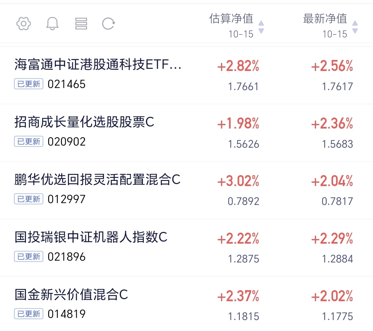 今天港股表现还是比较强势的,结束了单边下跌行情充分释放风险后,今天港股三大指数集体上涨。科技股多数上涨,创新药行情也出现明显回暖,港股通科技相对恒科布局更广泛,机会还是多一些,今天净值更新来了